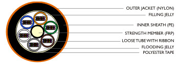 The loose tube containing optical fibres and jelly is centrally placed. Non - metallic strength members (FRP) are embedded in the HDPE sheath for protection and strength.